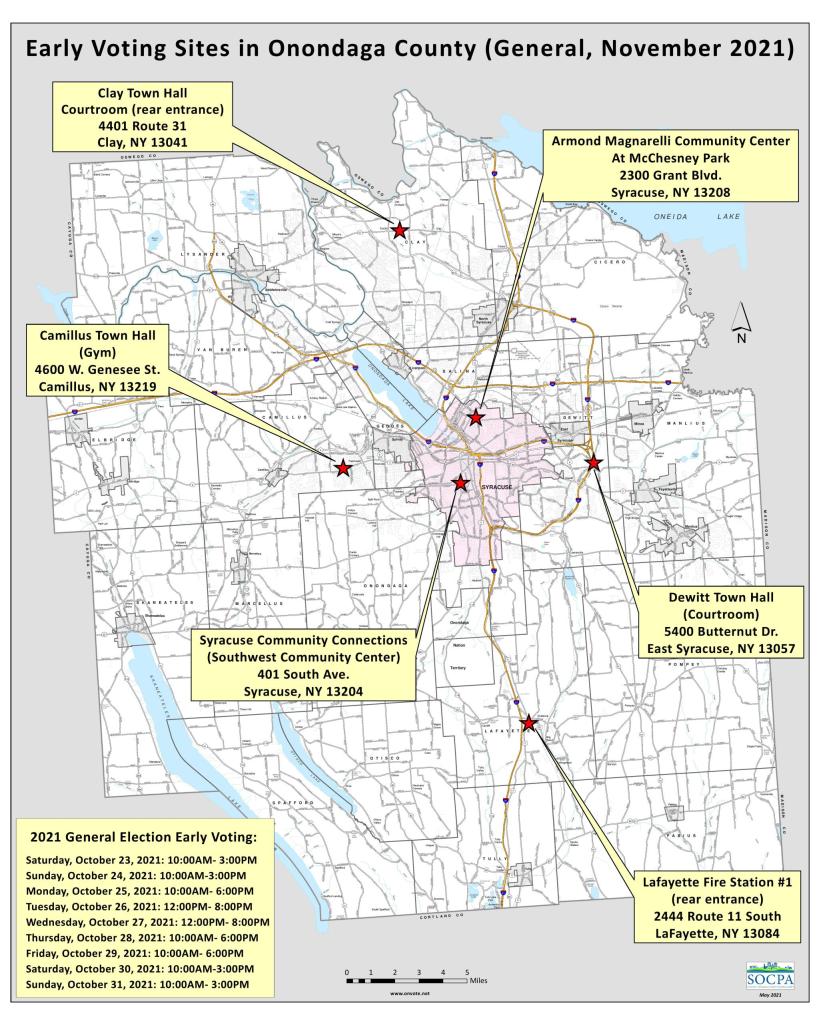 We agree on the six minimum sites for 2021. These are the same sites from 2020 with the exception of a temporary change moving from Camillus Fire Station to Camillus Town Hall for the General Election due to condemnation of the pedestrian bridge. We both agree that if we are to remain at 6 these sites are well spaced out and provide minimum needs for our voters. While some sites performed better than others the familiarity of these sites to the voters as well as coverage in North, South, East and West portions of the County and North and South west portions of the City of Syracuse spreads out the coverage as evenly as possible given the small number of sites.