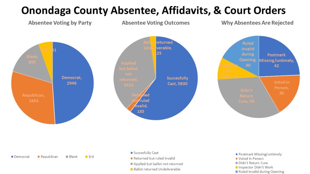 Welcome back to #wonkywednesday. Every week I take a write a column dedicated to election and registration data in Onondaga County and New York State. Absentee and mail in balloting has become needlessly controversial over the last two elections due to the rhetoric of the former President and his supporters. Furthermore in New York our arcane rules have put an unusual spotlight on mail in ballots as they were sequestered and not counted until 2 weeks after Election Day. Those rules will change for 2022. In a blow to mail-in ballot supporters the proposition for no-excuse balloting failed at the 2021 general election. Whether this dampers the growth we have seen in mail-in balloting in the future of New York will be interesting to watch in 2022 and beyond. This week I investigate the absentee, affidavit, and court order ballot data from the 2021 general election.