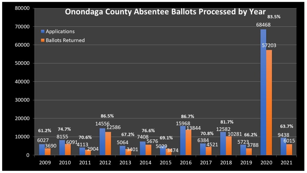Democrats continue to dominate Absentee voting in 2021 as they did in 2020. The 2946 ballots cast by Democrats accounted for nearly 49% of all ballots while the GOP (1843) accounted for 30.6%. Like with Early Voting Democrats outpaced their enrollment in Onondaga (38.4%) as did the GOP (27.3%). The story of the 2021 election continues to be non-enrolled voters participating at lower rates. Their 895 ballots were just 14.9% of the absentee ballot total despite being 27.3% of the overall electorate. There were 9438 absentee ballots requested overall with 3423 (36.29%) not returning their ballot. Another 225 the ballots were returned as undeliverable (2.4%) most likely permanent absentees who moved since last election.