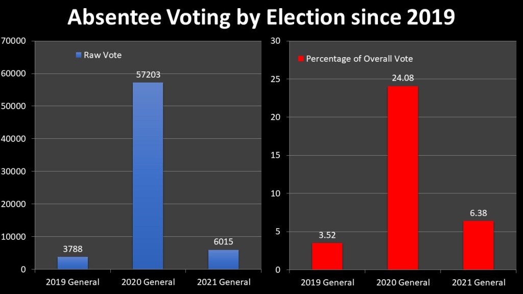 Ever since the reforms initiated in 2019 that brought about Early Voting the electorate has been adapting to the new options for voting. As we can see in 2019 the call for absentee ballots was low with just 3788 voters choosing this method or just 3.52% of the overall vote. Voters were turning to Early Voting for their alternative method. As COVID 19 raised its head in 2020 voters sought to stay at home and vote in record numbers with 57203 voters and a daunting 24.08% of the overall vote. In 2021 with COVID still lingering and voters used to alternative methods we did see a marked increase in ballots returned of 6015 and overall electorate percentage of 6.38%.