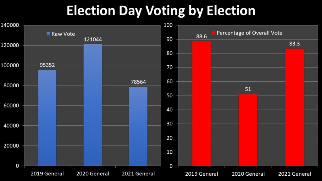 The reforms of 2019 and the COVID-19 pandemic have significantly decreased the election day portions. It is notable that during the presidential election only 51% of the electorate voted on Election Day, however in a time before vaccines amid a pandemic and in a high turnout election it is not the best comparison. The best comparison remains to 2019 and we do see a drop off in Election Day participation. The overall raw numbers drop from 95,352 in 2019 to 78,564 in 2021 is mostly due to a lower turnout year in 2021. The percentage of voters choosing Election Day though is lower as well. A drop of over 5% means voters are getting use to the alternative voting methods in Early and increase use of absentees. This is likely to continue to drop over time.