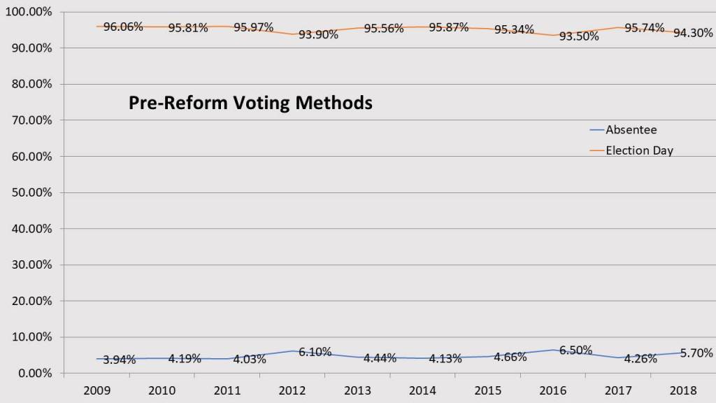 Non enrolled voters not surprisingly land in the middle of the two parties. The fluctuations in turnout with non-enrolled voters seem to affect their voting method choice which is not all that surprising. Though not enrolled in a party most studies show non-enrolled still have ideological leans. The N/E aligned with Democrats may be adopting their voting method preferences where the ne/s aligned with GOP. The n/e voting method breakdowns tend to reflect the overall breakdowns more than either party.