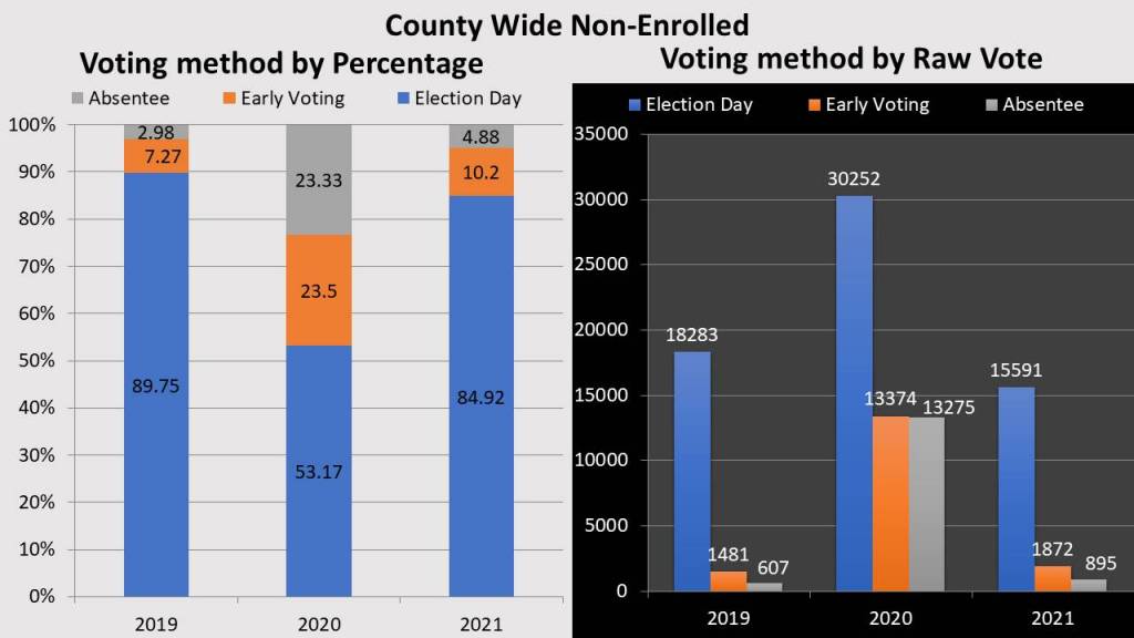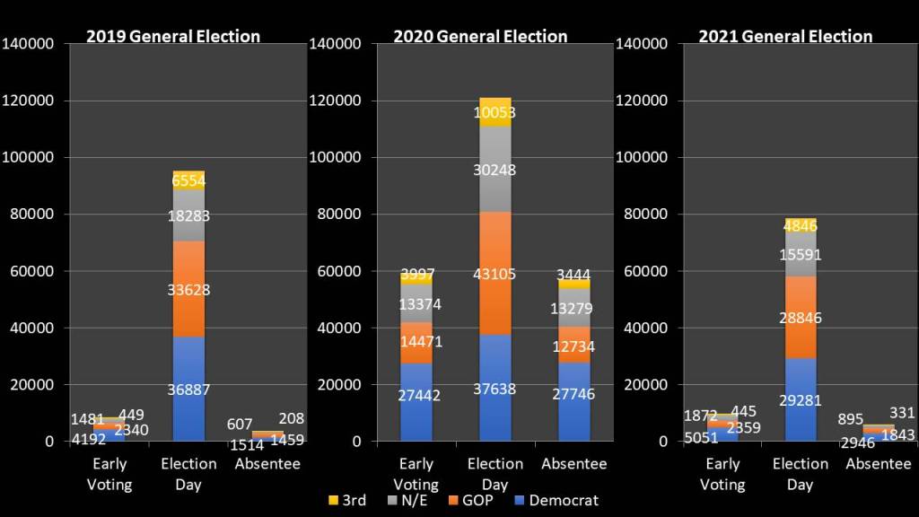 It may surprise some to see the GOP also grew its share and raw numbers of Early Voting and absentees from 2019 to 2021. Their vote share for Election Day dripped 2% points as some voters are starting to resist the national rhetoric. However they still largely outnumber Democrats in desire to vote on Election Day. Over 61% of their voters in the presidential year and over 87% in 2021 chose Election Day as their method. This compares to 40.55% for Democrats in 2020 and 78.55% in 2021.