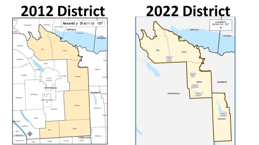 The 127th Assembly district has been represented by Assemblyman Al Stripe from 2006 to 2010 and then from 2012 until today. This district has long been seen as a swing district with Republicans up until recently outnumbering Democrats. The old #AD127 circled clockwise around Onondaga County. It included the Towns of Clay, Cicero, Manlius, Pompey, Fabius, and Tully. In the new maps #AD126 lost Pompey, Fabius, and Tully and replaced it with the Town of Cazenovia in Madison County. This makes the district slightly less compact dropping from a compactness score of 18.5 to 16.0.