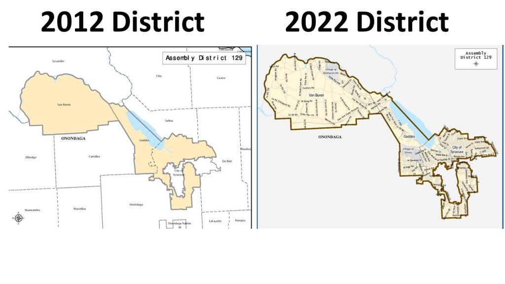 #AD129 has been represented by William Magnarelli (D) since 1998. This district snakes around the City of Syracuse going counter-clockwise from Eastwood, to Sedgewick, to Little Italy, down to Tipp Hill, Strathmore, the lower parts of the Valley and then up into Syracuse University. It also adds the Towns of Geddes and Van Buren. The new district is again virtually unchanged with a few inner city and eastside districts given back to #Ad128. The compactness score of this district went from 13.1 to 13.0 and is rated the least compact of the Onondaga County Assembly Districts.