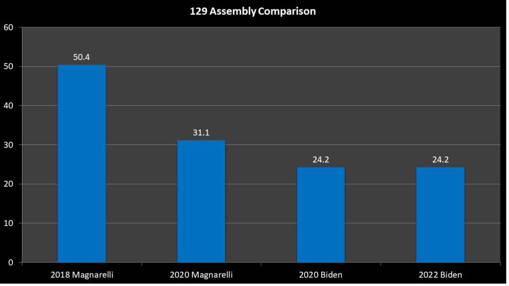 The 126th Assembly District has traditionally been GOP leaning district. Assembly member Finch won his election in 2018 by 13.0 points. Likewise Lemondes won his election in 2020 by 13.6 points. This is despite an electorate leaning towards Democrats. Trump won this district by 2.6 points in 2020. The new district does make this district more Democratic. If the 2020 election were held in the new district Biden would have won this district by 2.4 points. While a 5 point swing is significant the margins of recent victories by the Assembly members in the district suggest that swing may not be enough to tilt the district to the Democrats. Of note though is that many of the towns in Onondaga County and the City of Auburn in the district are trending more and more Democratic over the last ten years. If that trend continues this new district could become competitive with the right candidate.