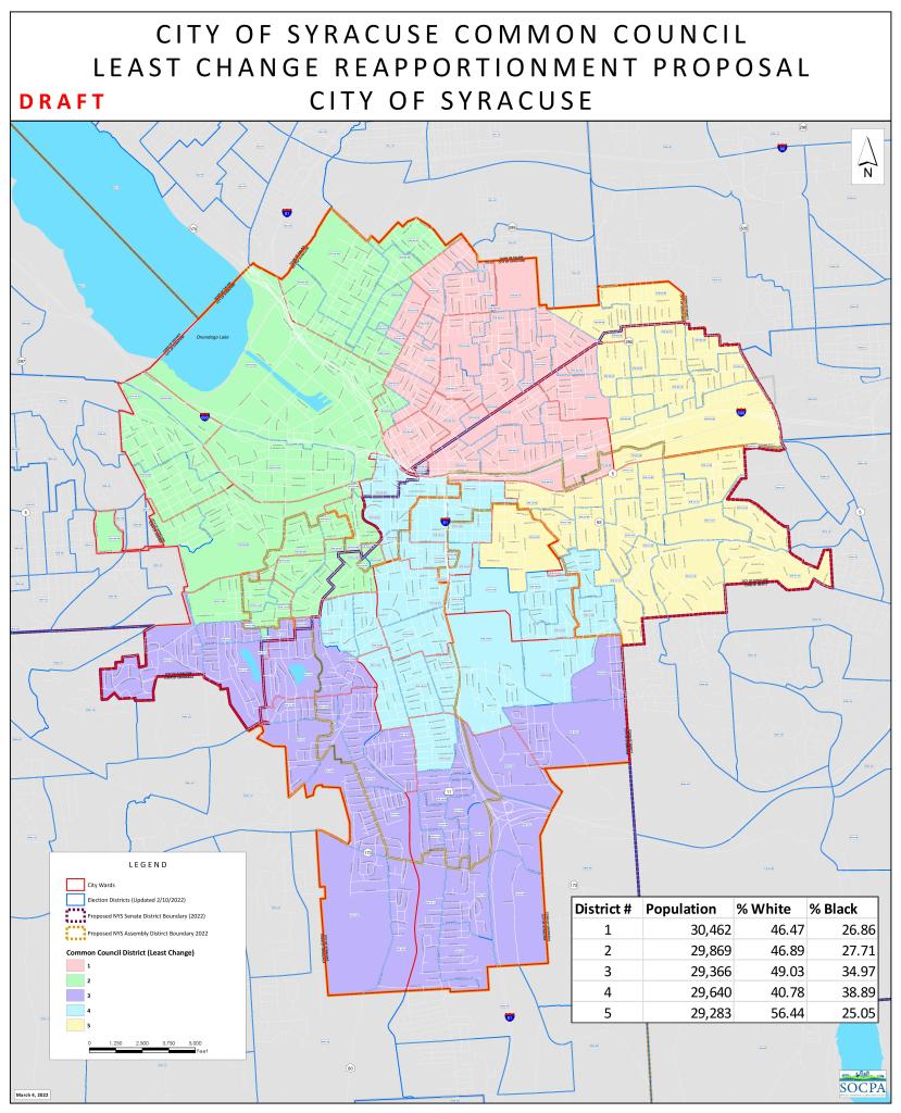 The decision not to adjust the districts in 2010 has had consequences. The emerging New American community in the north side of Syracuse has grown at a dramatic rate since 2002. This has put district 1 way out of proportion to the other districts. Under current NYS law these districts can not continue as the difference between the top district (CC1 33,148) and bottom district (CC2 27,183) is almost 18%, well over the 5% difference called for by law.