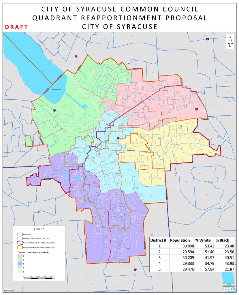 In thew quadrant concept I envision 5 different districts with different needs. Common Council 1 would unite the neighborhoods of Lincoln Hill, Eastwood, and Strathmore. These communities already interact with each other and share Henninger Highschool as a common scholastic focal point. Common Council District 2 would unite the North Side Little Italy community with Tipp Hill. These communities are relatively small and different from the bordering communities around them. Using the commercial corridor of Destiny USA to join them makes a district that is not much different than the current 2nd district but keeps the North side whole inside the district as well as Tipp Hill.