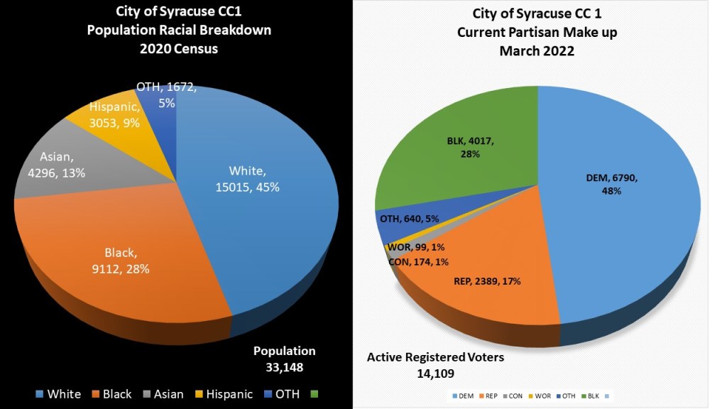 Welcome back to #WonkyWednesday. Each week I take a deep dive into the electoral and registration data that make up Onondaga County and New York State. Over the next few weeks I will be investigating the City of Syracuse. Usually I dedicate #wonkywednesday articles to races happening in the current year, however there are no races in Syracuse this year. I am continuing my run of Syracuse articles to highlight the Syracuse Independent Redistricting Commission will be holding 4 more public meetings over the next 6 weeks to develop their draft redistricting plan. This citizen led redistricting process depends on you to give input before they redistrict the five common council districts that make up our city. At the end of this article, I will post the next meeting times so you can attend. This week I am focusing on the most populous Common Council District, Common Council #1.