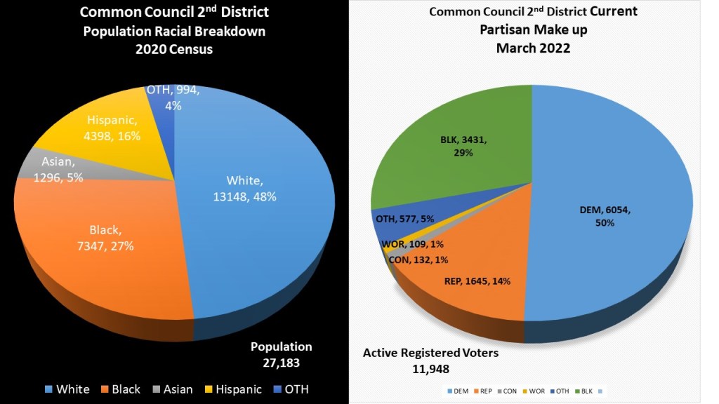 In the 2020 Census the 2nd Common Council district was reported to have 27,183 residents in the 2020 Census. In terms of population this is the lowest district of all 5 districts. The racial breakdown is 48% White, 27% Black, 16% Hispanic, 5% Asian, and 4% other. This makes the 2nd district the highest concentration of Hispanic population in the city. Partisan wise it is dominated by the Democratic Party with just over 50% of the enrolled voters, followed by 29% Blank (non-enrolled), and just 14% GOP. While Democrats dominate every district, this district is the 2nd least Democratic in terms of enrollment overall.