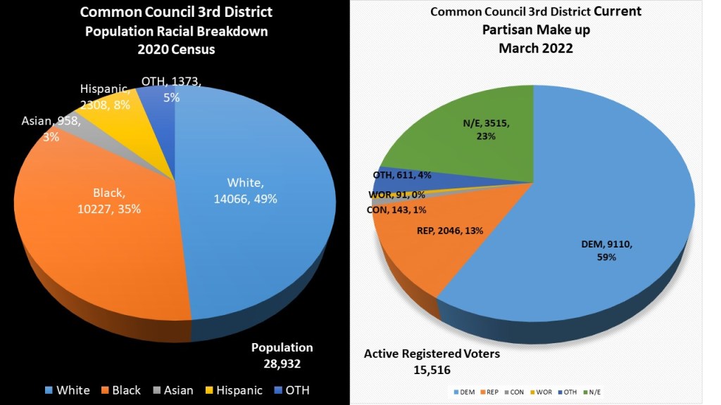 In the 2020 Census the 1st Common Council district was reported to have 28,932 residents in the 2020 Census. This means the 3rd Common Council district is slightly under populated, and the 2nd least populated district in the city. The racial makeup of the Common Council 3 according to the census is 49% white, 35% Black, 8% Hispanic, 3% Asian and 5% other. The racial makeup of the district, though technically majority minority, is the 2nd least racially diverse in the city. Voter registration wise it is 59% Democratic, 13% GOP, 23% Blank or non-enrolled. At 15,516 registered voters it contains the most registered voters in the city despite its smaller population size.