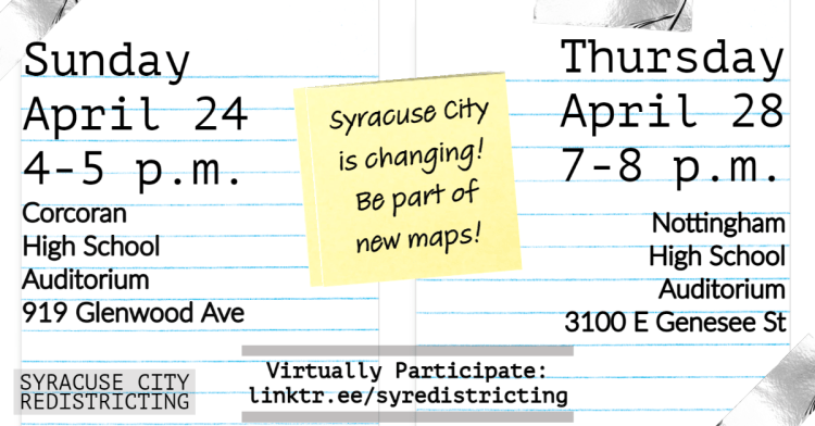The City of Syracuse Independent redistricting Commission will meet four more times over the next six weeks to hear from the public on what they want from their new districts. They will be holding hearings at each of the city high schools. The first redistricting was on Friday March 18th at ITC High School, and the second at Fowler PSA on March 26th, and third hearing was at Henninger High School at 7pm. You can watch the live streams from Fairmaps CNY here. The final two pre-draft meetings will be April 24th at Corcoran High School at 4pm and April 28th at Nottingham High School at 7pm. You can give testimony about what you would like to see in your city for the next ten years. In May they will release draft maps and another round of hearings will begin.
