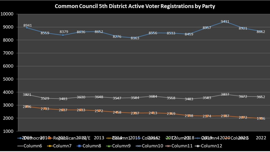In the 2020 Census the 5th Common Council district had 29,717residents. This means the 5th Common Council district sits directly in the middle in terms of population of all five districts and near the ideal average of 29,724. The racial makeup of the Common Council 5 according to the census is 57% white, 25% Black, 10% Hispanic, 5% Asian and 3% other. This makes it the least diverse district of all five in the City of Syracuse. It is also the only White majority district in the City of Syracuse. Voter registration wise it is 57% Democratic, 13% GOP, 24% Blank or non-enrolled. It is also an extremely highly registered district with 15,137 registered voters, the second most in the city.