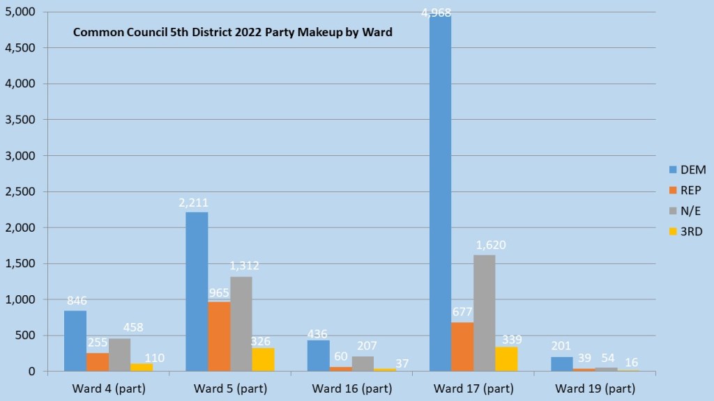 The third Common Council district stretches over five different wards inside the city. It is the only districts that does not contain a Ward entirely inside of it. This district though is dominated by the 17th ward portion. The liberal Democratic enclave of the east side not only has the most registered voters, but the Democratic lean gives the district its heavy Democratic influence. The portion of the fifth ward that is part of the district is the main section of Eastwood and is seen as the other half of the district, though in terms of size it is closer to a third of the district. Small parts of the 4th, 16th, and 19th are add-ons to the district.