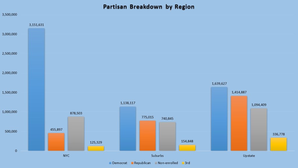 While each region varies in their partisanship, specially from county to county, the regions as a whole are generally Democratic. New York City NYC (3,151,631 Democrats (68.3%), 455,897 GOP (9.9%) and 878,503 & non-enrolled (19.1%) is overwhelming Democrat with the non-enrolled not just outnumbering but over double the GOP. In the Suburbs things get a little better for the GOP but Democrats still have a Plurality of voters (1,138,117 Democrats (40.5%), 775,015 GOP (27.6%), 740,845 non-enrolled (26.4%)). The Non-NYC rest of New York State the GOP fares the best but even their Democrats have a small plurality (1,639,627 Democrats (36.6%), 1,414,887 GOP (31.5%), 1,094,409 non-enrolled (24.4%)).