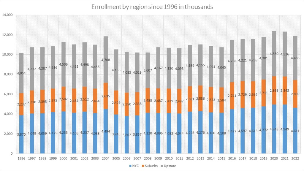 New York State Voter Enrollment has grown dramatically since 1996. In 1996 New York had 10,162,156 voters. That had grown in February of 2022 to 11,905,886, a growth of 17.2%. New York City has grown as well at a rate of 19.1% with the suburbs of NYC growing the fastest at 25.5%. Non-NYC counties saw a lagging growth rate of just 10.6%. This resulted in a shift in New York voting power downstate. The Non-NYC counties were more populous in 1996 accounting for 39.9% of the voters but fell to 37.7% of the voters. New York City grew its share of New York voters slightly from 38.0% to 38.7%. However, the NYC suburbs have seen the largest vote share gain growing from 22.0% to 23.5%.