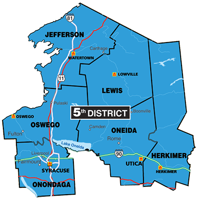 The 5th Judicial district is a pretty evenly split district. Republicans have the smallest plurality of enrollment with 35% of the district. Democrats are 33% of the district in a close second. Non-enrolled are 25% of the district. By region Onondaga County dominates the district with 48% of the enrolled voters, Oneida County comes in second at 21% of the voters, and Oswego (12%), Jefferson (10%), Herkimer (6%) and Lewis (3%) round out the six-county district.