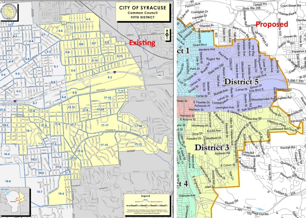 Finally, another wrinkle is that this vacancy occurs while Syracuse is undergoing redistricting for their five common council districts. The Syracuse Independent Redistricting Commission has been working for nearly a year on new maps for the five common council districts. They have just released their final map they plan to submit to the common council. That map alters the fifth common council district essentially breaking it up into two different districts keeping Eastwood in the new district five along with Sedgewick and Lincoln hill neighborhoods. The traditional east side and university is united together. This map improves the districts for the residents of those neighborhoods.