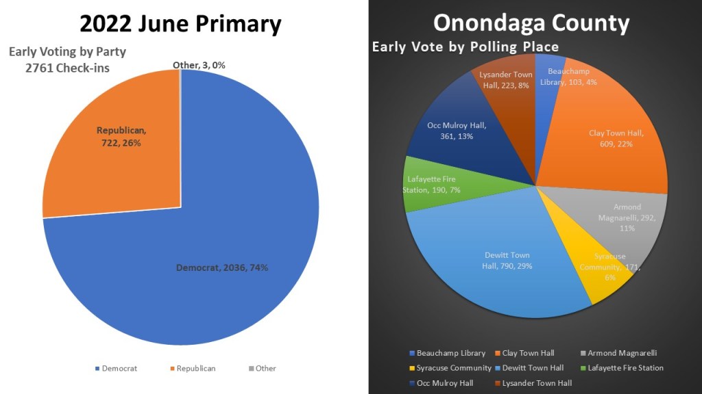 During the June #Early Voting period 2761 voters checked in via the poll pads. Of those that checked in 2739 received ballots and voted on the machines. The other twenty-two voters received affidavit ballots. More voters also received affidavit ballots that did not check in since they were not part of the voter record. We will address affidavits in next week’s #wonkywednesday. Of the 2761 check-ins 2036 were Democrats, 722 were GOP, and three were not enrolled in a party and voted by affidavit. Of the eight sites for #Early Voting Dewitt town Hall was the most popular choice for voters with 790 check-ins at 29% of the overall vote. This was followed by Clay Town Hall (609 22%), OCC Mulroy Hall (361 13%), Armond Magnarelli Center in Syracuse (292 11%), Lysander Town Hall (223 8%), Lafayette Fire Station #1 (190 7%), Syracuse Community Connections (171 6%) and Beauchamp Library (103 4%).