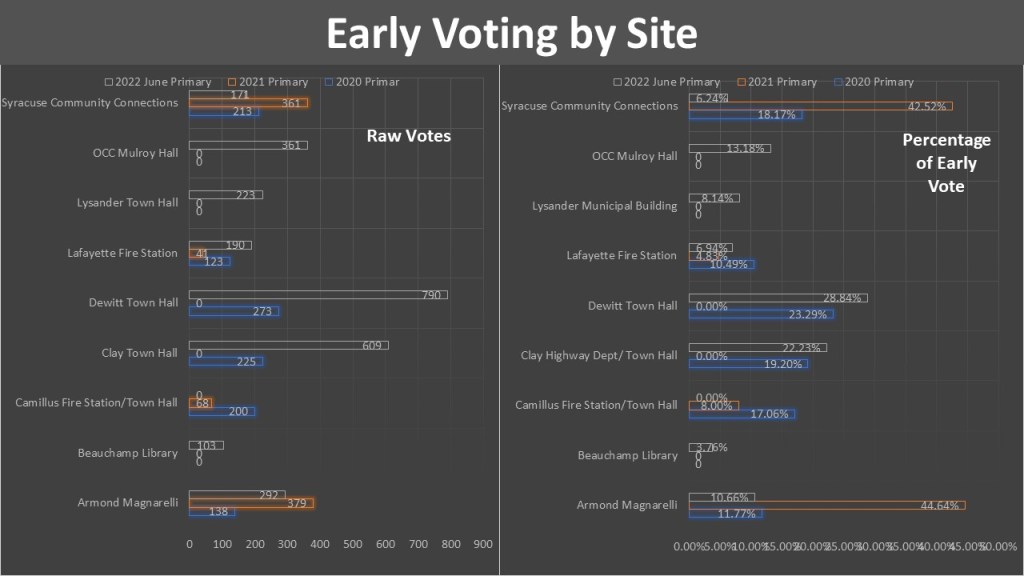 We added three new sites for #Early Voting primary this year, OCC Mulroy Hall, Lysander Town Hall, & Beauchamp Library. A fourth site, North Syracuse Community Center will be added for the General Election. Likewise, one of our six original sites, Camillus Town Hall, had scheduling conflicts and we are not using them for June or August. Dewitt Town Hall led in both primaries it was used (2020 & 2022) while Armond Magnarelli was the winner in the City of Syracuse primary in 2021. Of the new sites OCC Mulroy Hall came in third place in 2022 and faired the best, Beauchamp Library unfortunately was the worst site overall. We are starting to see a pattern of usage emerging with top tier sites for primaries being Dewitt and Clay followed by mid-tier sites like Armond Magnarelli, Camillus (when used), and the possible additions of OCC Mulroy Hall and Lysander Town Hall into that group. Syracuse Community Connections Lafayette Fire Station and Beauchamp library look to be lower tired sites. This tracking of usage will allow us to start to adjust staffing levels at individual sites.