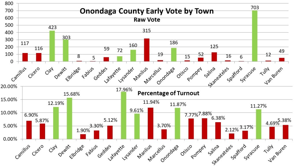 With the addition of more sites, we have more areas of the County closer to Early Voting sites than ever. It is no surprise that the closer to a site the higher percentage of your overall vote will choose Early Voting. Lafayette, though a smaller use site, votes the highest of its overall vote early at 17.96%; this is followed by the other Early Voting sites: Dewitt (15.68%), Clay (12.19%), Onondaga (11.87%), Syracuse (11.27%) and Lysander (9.61%). The one town that outperforms without having an Early Voting site in it is Manlius at 11.94% of its voters choosing to Early Vote, however the Dewitt site is strategically located near the border allowing both towns to Access it. In fact, the three worst towns Elbridge (1.90%, Skaneateles (2.12%), and Spafford (3.17%) are the only three towns that do not border a town with an Early Voting site.