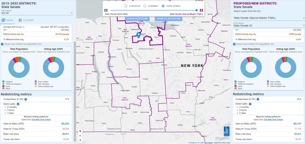 Redistricting brought a great deal of change to the New York Senate districts. Senator Mannion’s #SD50 district, like May’s #SD48. The old #SD50 nearly encircled the City of Syracuse starting in the towns of Dewitt and Manlius and grabbing all of the Western Half of Onondaga with a few towns in Cayuga and just parts of the City of Auburn and Syracuse. The new #SD50 is a radically different district. It did keep the towns Clay, Dewitt, Geddes, & Manlius in Onondaga County and added Salina & Cicero. It lost all of the rest of Onondaga County and Cayuga county areas. The Special Master decided to stretch this district north and pick up the entire southern half of the county of Oswego including the cities of Oswego and Fulton.
