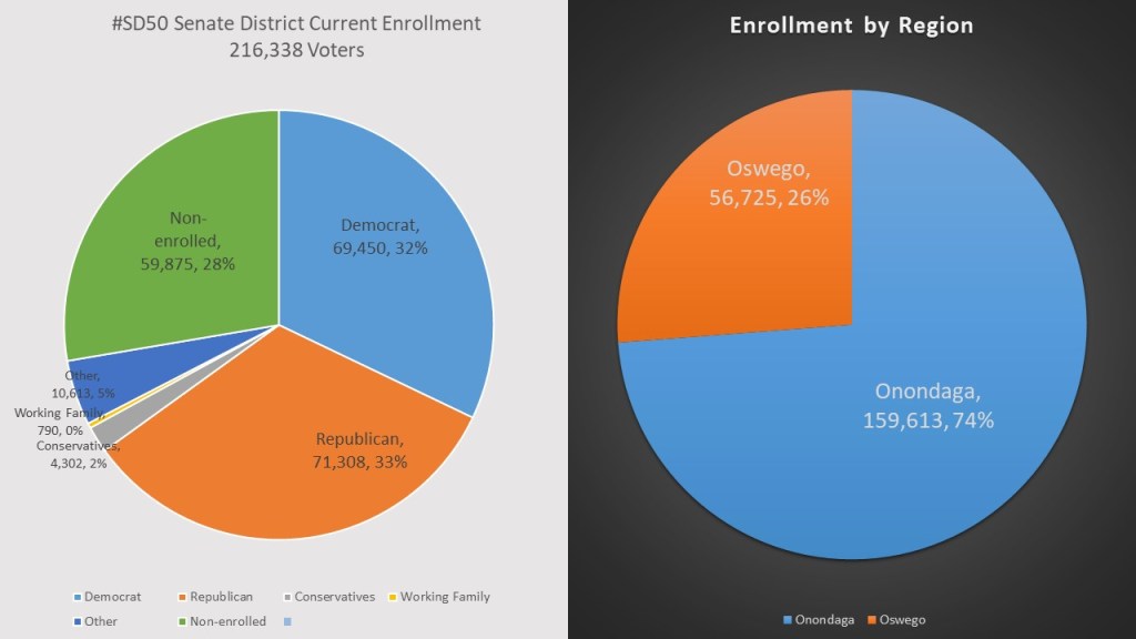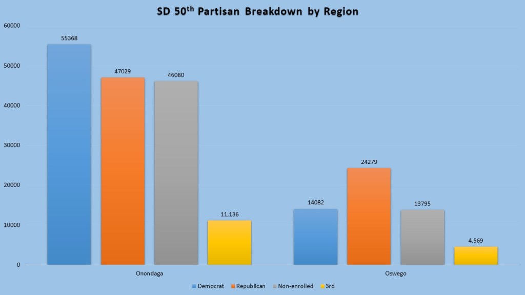 The redistricting created one of the most competitive Senate districts in the state. Republicans have a slight edge in the district with 33% of the enrollment followed closely by Democrats with 32% of the district. The Non-enrolled are a close third with 28% of the vote setting up one of the more closely divided districts in the Senate. This seat is divided into two counties, but not equally. Onondaga dominates the district with 74% of the registered voters, but Oswego at 26% can still have sway in the district.