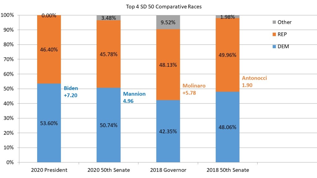 It is even harder to get comparative races for this district then #SD48. Instead of doing five comparative races I have had to pare down to four. I am not studying the 2020 congressional race in the district since the Oswego portion of the district was made up of two different congressional races and the comparison would be so different as not to have any weight. Like #SD48, I throw in the results from the last two races John Mannion was in. He lost 2018 by 1.9 points and won in 2020 by 4.96 points. Remember these results are under the old district lines. If the 2020 election were run under the new lines, Joe Biden would have won the district by 7.20 points. Likewise, if the 2018 Governor’s race were run under the new lines Molinaro would have won the new district by 5.78 points.
