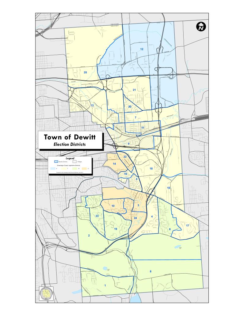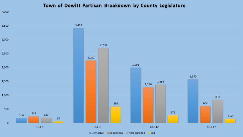 Dewitt is the only town in Onondaga County with 4 legislative zones. This is despite their relatively small population. The only legislative portion that has a GOP plurality is OCL5 which is paired with parts of Cicero and Salina in the lobster formation in the old maps. OCL 7 is the largest portion and most Democratic as it encompasses East Syracuse as well as portions of the North side and southeast side of Syracuse. OCL 17 is also a very Democratic district as it pairs the immediate southeastern suburbs in Dewitt with the 17th Ward in Syracuse. Even the Jamesville portion of Dewitt represented in OCL 12 has a Democratic lean, though that portion is washed out in OCL 12 by the GOP southeastern towns.