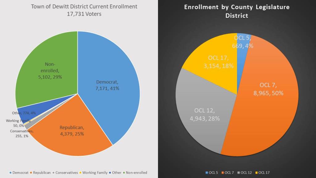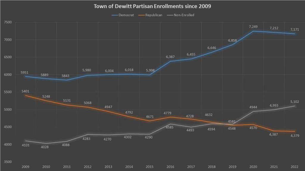 Dewitt has had a rapid rise to becoming a solidly Democratic town. In 2009, though Democrats had a plurality, this disparity between Democrats and GOP was just 550 votes. Since 2009 Democrats have gained 1,220 voters while the GOP has lost 1,022 voters. The Non-enrolled has gained 1,001 voters during that time as well. In 2019 the non-enrolled overtook the GOP. When this happens it typically means the party falling below the non-enrolled line is not competitive. Since 2019 the only non-Democrat who has won Town office is David Gideon for a republican Town Justice in 2020 and Rocco Conte a registered Conservative who is the Highway Superintendent. Both of whom are long term incumbents.