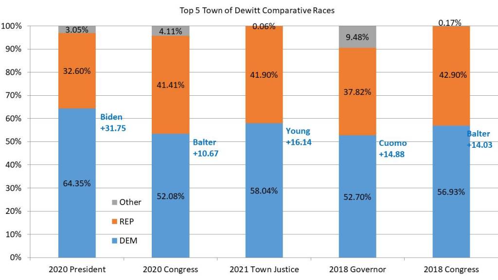 In the top 5 comparative races we see dominant Democratic performance to go along with the registration. All of the races the Democrat won by double digits and with over 50% of the vote. Dana Balter won Dewitt twice, in 2018 (+14.03%) & 2020 (+10.67%). She did better in 2018 as there was a significant 3rd party vote in 2020 splitting off Democratic votes. Governor Cuomo won the town of Dewitt by 14.88% in 2018. President Biden dominated Dewitt winning by 31.75% points in 2020. The best equivalent one on one race in Dewitt in recent memory is the Town Justice race in 2021. The Democrat Sam Young won by 16.14% in a year where Democrats did not do well in Onondaga County.