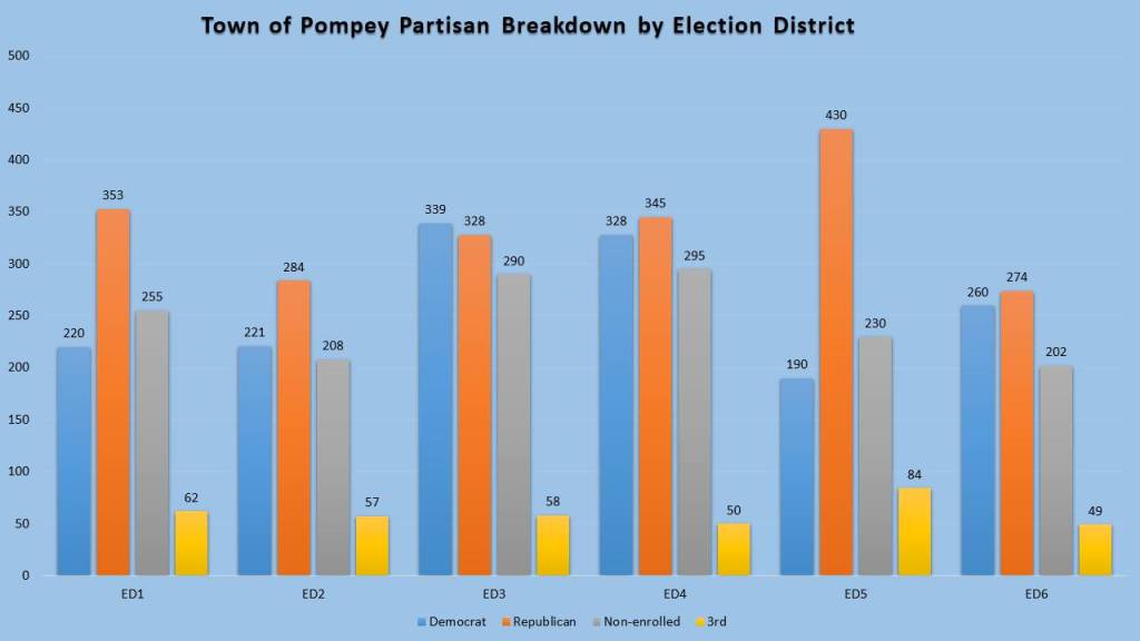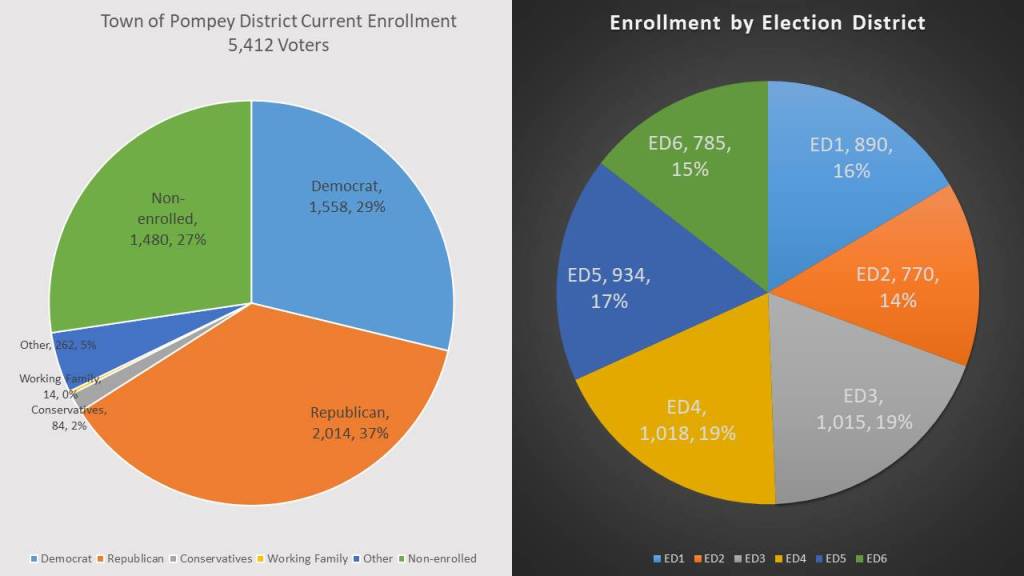 Unlike the other towns we examined this year, Democrats do not have a plurality. Democrats only represent 29% of the town registered voters, and the GOP has the plurality at 37%. The non-enrolled at 27% is in third place. The town is wholly contained in a County Legislative district so we will examine the 6 election districts it is made up of. They are pretty evenly split in voter populations with ED 19%-14% of the town’s voter population. The most populous are the north eastern EDs 4&5 that border Manlius.