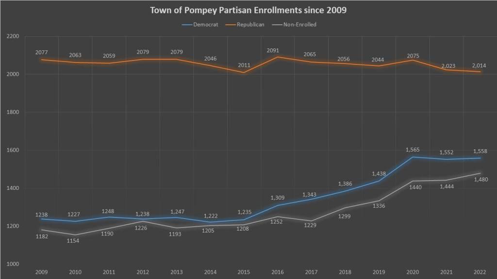 Though the Town of Pompey is a solidly red town it was not immune to the Trump effect on suburban communities. From 2009 to 2022 the GOP lost just 63 voters staying relatively stable. Democrats in the meantime have added 320 voters. The Non-enrolled have also gained 298 voters. This allowed for the formation of Team Pompey, a collection of Democrats, Independents, and GOP voters that fought back against the attempted trumpification of their town in 2019 by the local GOP party establishment. They were able to piece together a winning coalition to flip the supervisor and a majority of town board races.
