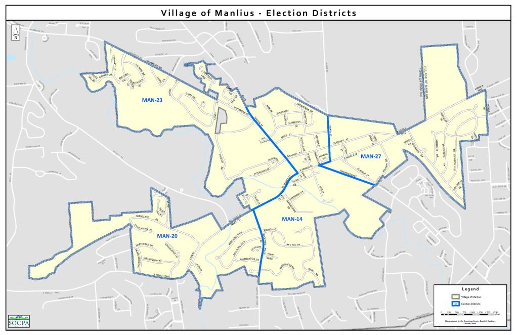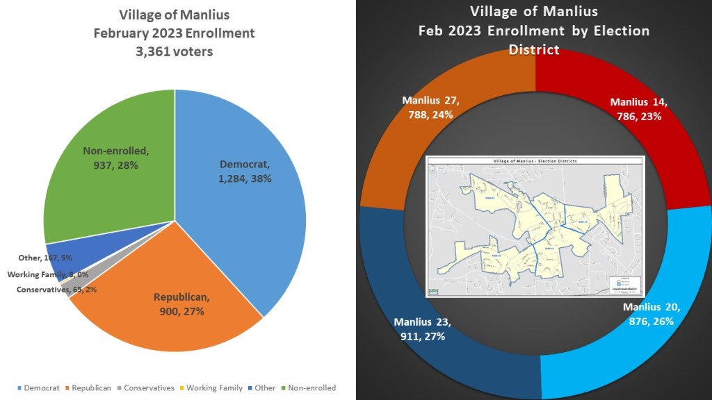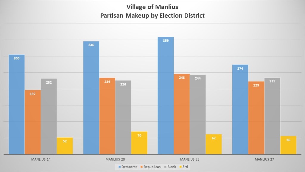 The Village of Manlius has 3,361 voters. The Village of Manlius partisan breakdown shows a strong Democratic lean. Democrats have 1284 (38%) of the active registered voters, 937 (28%) are registered as non-enrolled, and in third place 900 (27%) are registered GOP. With non-enrolled outnumbering GOP and Democrats well in first place it is typical of the other strong Democratic communities in our county. The village is split into four different election districts, Manlius 14, 20, 23, & 27. They are remarkably similar in size, with the largest being Manlius 23 at 911 voters (27%) and the smallest being Manlius 14 at 786 (23%).
