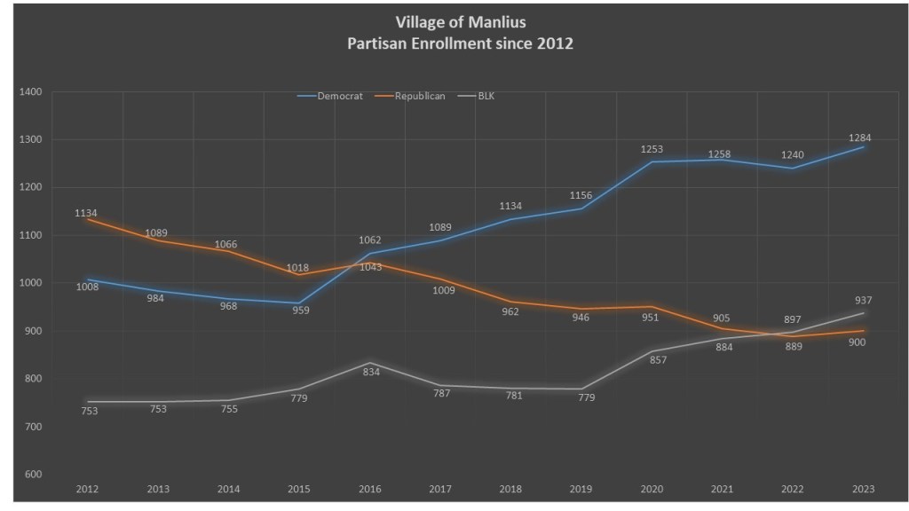The Village of Manlius, like the other suburban communities, have undergone a transformation. Once a dominant GOP village, the community was losing GOP voters on a steady pace until 2016 when the Trump election saw large party changes in suburban communities. Since 2012 Democrats have gained 276 voters while the GOP have lost 234 voters. Democrats had the most gains but the non-enrolled have seen a gain of 184 voters, and in 2022 they overtook the GOP as second in the village.