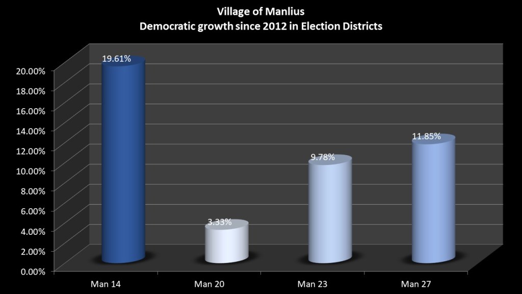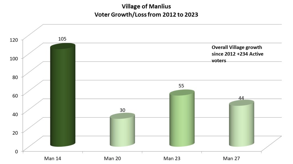 When we look at voter growth the village of Manlius has gained 234 voters since 2012. The lions share of that growth has been in Election District 14 gaining 105 voters despite it being the smallest Election District. This is followed by 55 voters in Manlius 23 which is the largest ED. Manlius 27 has gained 44 voters. Showing the least growth is Manlius 20 with only 30 votes.