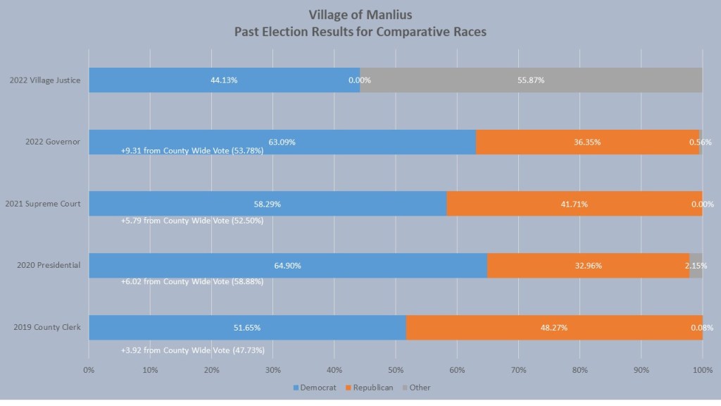 When we look at the comparative races, we see a village that solidly votes Democratic in November, but more evenly split when a March village election happens. In the 2022 Governor’s Race the village of Manlius voted for Governor Hochul by 63.09%, 9.31% more than the rest of Onondaga County. In 2021 the Village of Manlius voted for Democrat Ant%, 6.02% more than Onondaga County as a whole. Despite losing Onondaga County, Mark Kolinski carried the Village of Manlius with 51.65% in the 2019 County Clerk race, +3.92% ahead of the countywide results. The race for Village justice in March last year did not go the Democrats way with only 44.13% of the village voting for the Democratic candidate. The GOP does not run candidates on their party line preferring to run on independent nomination lines and they won the 2022 Village justice race with over 55% of the vote.