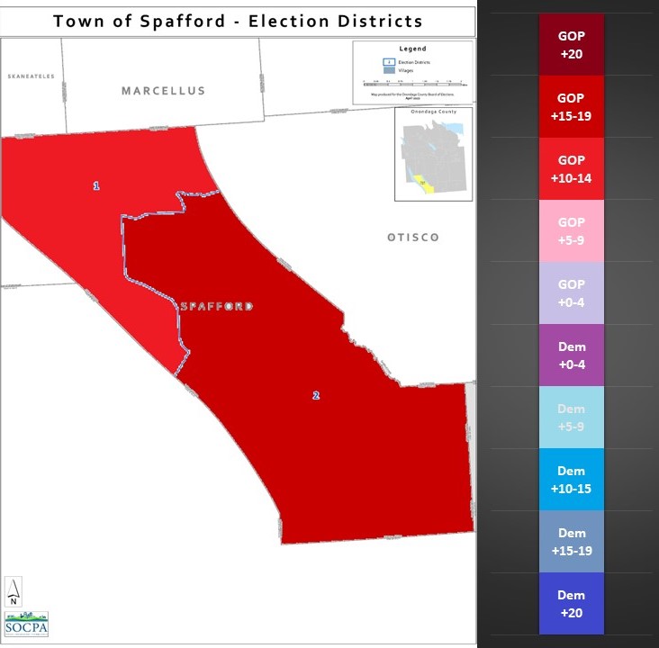 The Town of Spafford sits in the southwestern portion of the County. The Town of Spafford is the smallest town in terms of active voters in Onondaga County. On its face the town of Spafford is a solidly GOP town. The makeup of Spafford is 28% Democrat (370 Voters), 42% GOP (550 Voters), and 24% non-Enrolled (309 voters). While a solid GOP enrollment the Democrats have remained in 2nd place and not been overtaken by the non-enrolled. Because it is a small town it only has two election districts, a northern district ED 1, and Southern district ED 2. The northern ED slightly outnumbers the southern ED 698 voters to 613.
