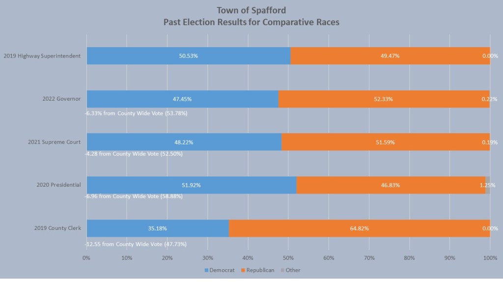When we look at the comparative races, we see a Town that swings how it votes based on the election. Spafford is solidly more conservative than the rest of Onondaga County but less conservative than their voter registration gaps might indicate. In 2022 the Town of Safford voted for Governor Hochul’s opponent Lee Zeldin by 52.33%, Hochul dis 6.33% wors than her win in Onondaga County rate of 53.78%. In 2021 the Town of Spafford voted for Anthony Brindisis’ GOP opponent for Supreme Court by 51.59%, Brindisi was off by 4.28% of the county result rate of 52.50%. In 2020 Spafford surprisingly voted for President Biden 51.92%, though 6.96% points behind his Onondaga County win of 58.88%. In 2019 Spafford had its most decisive GOP vote of the comparative races voting for Lisa Dell by 64.82%, with Democrat Mark Kolinski losing 12.55% ahead of the Onondaga County rate of 47.73%. As I stated before Democrats have actually had success in Town government. In the last competitive head to head race Jody Fisher (D) won the Highway superintendent race by 50.53% in 2019 and ran unopposed in 2021. In 2021 Democrats came within a couple percentage points of sweeping both Town Board races.