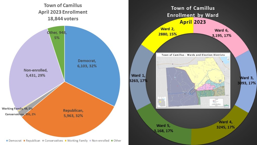 The wards in Camillus are represented by the GOP, though the representative in Ward 5, Richard Griffo, has won cross endorsement when he has run. However, these wards reflect the changing nature of Camillus. Ward 1 and Ward 2, represent the western and northern parts of Camillus have solid GOP leans in their enrollment. Wards 3,4,5, & 6 all located in the more populous southeastern corners have Democratic pluralities, with Ward 3, the most eastern district, looks the most promising for Democrats with the non-enrolled threatening to overtake the GOP.