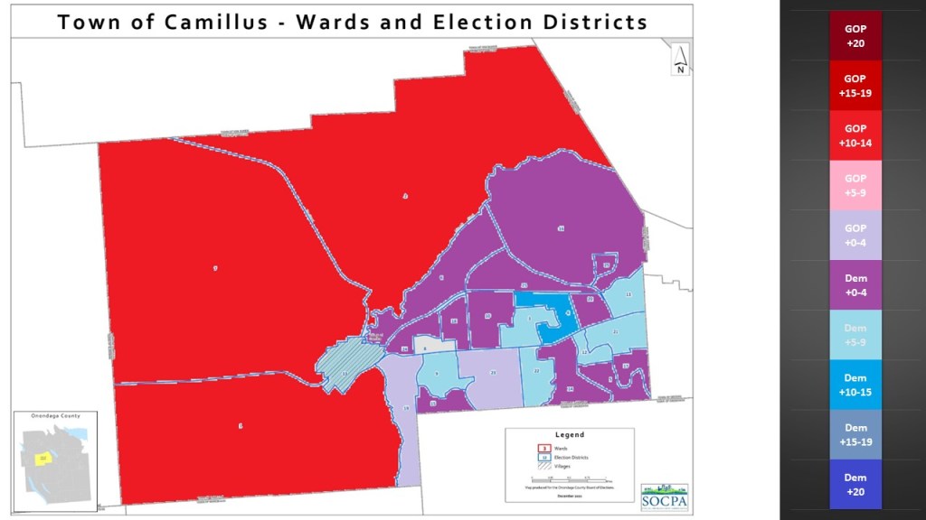 The Town of Camillus is in the western suburbs. Though it is a medium sized suburban town with 18,844 voters. Tt doesn’t share a border with Syracuse nestled between Elbridge, Van Buren, and Geddes. The Town of Camillus is considered a purple town with Democrats recently gaining the smallest of a plurality. The makeup of Camillus is 32% Democrat (6103 Voters), 32% GOP (5963 Voters), and 29% non-Enrolled (5431 voters). One of the few towns that have a near equal share of the three major political identities. The Town of Camillus is the second of two towns that are broken up into wards, meaning they elect their town boards in predetermined areas rather than town wide. There are six town wards in Camillus. Ward 1 has 3263 voters (17%), Ward 2 2880 voters (15%), Ward 3 3093 voters (17%), ward 4 3245 voters (17%), ward 5 3168 voters (17%), and ward 6 3195 (17%). These wards are fairly equal because the Town Board of Camillus underwent a redistricting process last year that fixed some of the overpopulation. The wards are similar to the old ones and make sense in terms of geography and shape. Though to get equal portions they did create a small balloon appendage in ward 3.