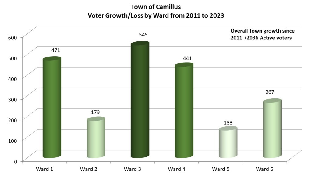 Looking at the growth of voters since the last redistricting cycle we compare it with date from October 2011, before the redistricting of 2012. The Town of Camillus grew by 2036 active voters since 2011. Wards 3 the most Democratic and smallest geographic ward, is the biggest gainer with 545 more voters. Ward 1, the largest geographic ward most GOP ward grew quite a bit, with 471 new voters. Ward 4 also grew quite a bit with 441 voters. Ward 2 (+ 179), 5 (+133), 6 (+279) all had moderate growth. The fluctuations in growth are most likely due to the redistricting earlier this year, mainly to address the overpopulation in Ward 2 and underpopulation in ward 4.