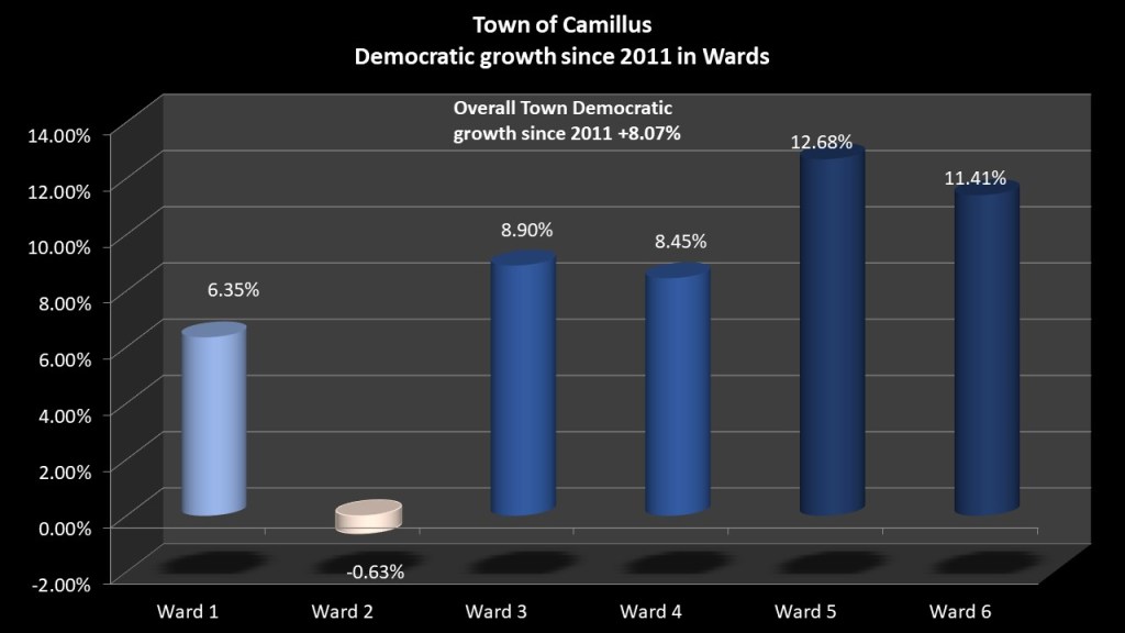 The Town of Camillus Democratic advantage has grown by 8.07% since 2011, which is typical growth we have seen in Onondaga County. Ward 1, the most GOP district has seen growth in the partisan difference for Democrats as they narrowed the gap by 6.35%. Ward 2 actually saw GOP growth of .63%, which is mainly due to a Democratic voting block being moved into another ward during redistricting. The Southeast wards saw the most Democratic growth. Wards 3 (+8.90%) and Ward 4 (+8.45%) saw strong Democratic growth. Wards 5 (+12.68%) and Ward 6 (11.41%) saw even stronger Democratic growth. In fact, Wards 3,4,5,6 were all GOP dominated wards in 2011 and now have flipped to have a Democratic plurality.