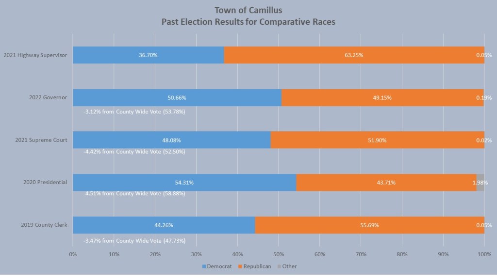 When we look at the comparative races, we see the duality of a purple town in Onondaga County. In even years Camillus votes solidly for Democrats at the top of the ticket, and in odd years it votes republican. In 2022 the Town of Camillus voted for Governor Hochul’s by 50.66%, 3.12% worse than her win in Onondaga County rate of 53.78%. In 2021 the Town of Camillus voted for Anthony Brindisis for Supreme Court by 48.08%, Brindisi was off by 4.42% worse than the county result rate of 52.50%. In 2020 Camillus voted for President Biden 54.31%, 4.51% points behind his Onondaga County win of 58.88%. In 2019 Camillus voted for Democrat Mark Kolinski for County clerk by 44.26% losing 3.47% of his Onondaga County rate of 47.73%. The last head-to-head town office where Democrats contested was Highway Superintendent, and it did not go well for Democrats, losing by over 26%. We see that Camillus is running about 3-4 points behind Onondaga County as a whole because it is near even registration where Onondaga County is more blue leaning registration wise.