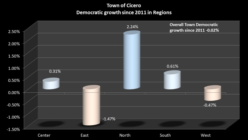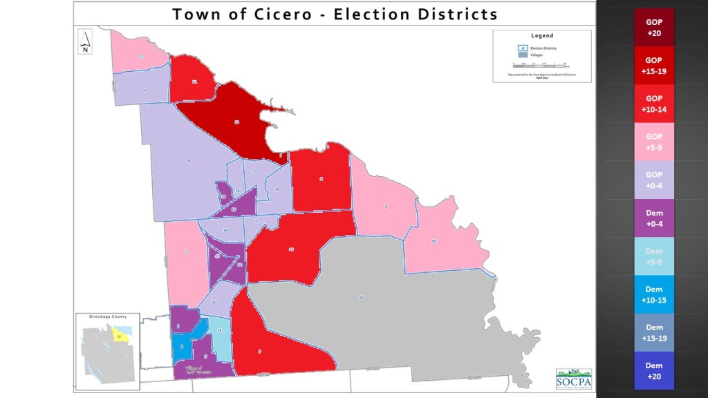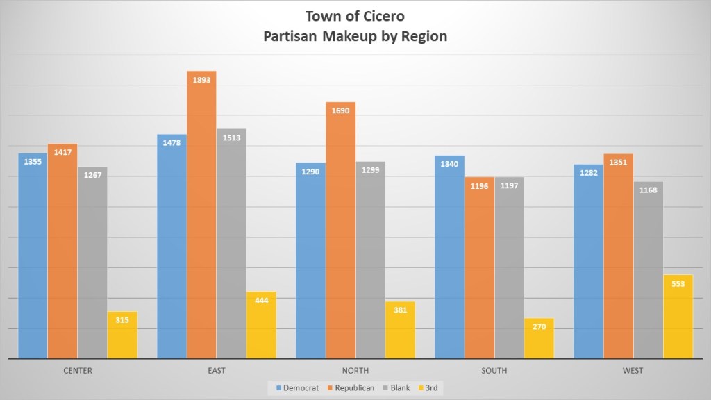 The regions in Cicero have a wide disparity. The Southern region including a portion of the village of North Syracuse is the most Democratic friendly. The Western region of Cicero that shares a border with Clay shows a small GOP advantage. The densely packed Center region with some of the more developed housing units also has a slight GOP lean. The GOP gains its advantage in domination of the Northern Bridgeport area and the Eastern portion of Cicero that is less densely packed. There they dominate and can dominate the entire town.