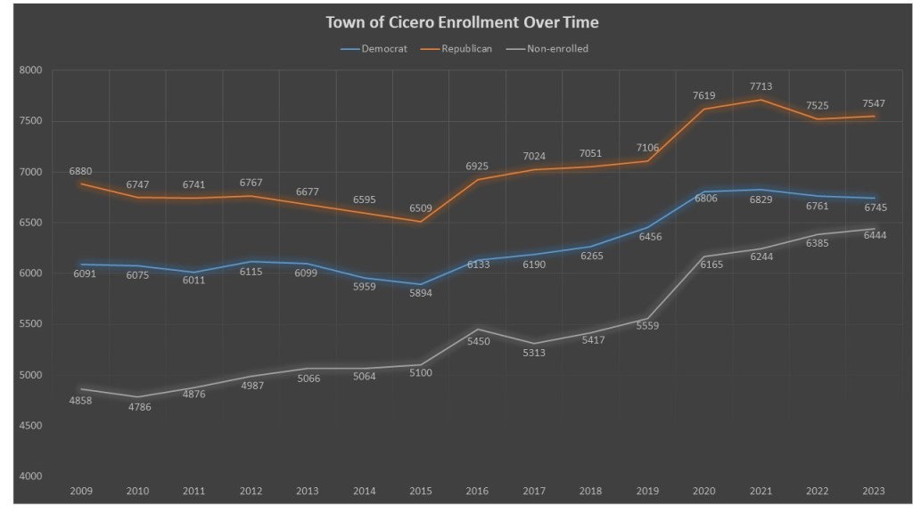When we look at the comparative races, we see a solidly GOP town that votes significantly to the right of Onondaga County as a whole. In 2022 the Town of Cicero only voted for Governor Hochul’s by 41.96%, 11.82% worse than her win in Onondaga County rate of 53.78%. In 2021 the Town of Camillus only voted for Anthony Brindisis for Supreme Court by 39.45%, 13.05% worse than the county result rate of 52.50%. In 2020 Cicero was one of the few communities that didn’t vote for President Biden only giving him 46.59%, 12.29% points behind his Onondaga County win of 58.88%. In 2019 Cicero voted for Democrat Mark Kolinski for County clerk by only 37.50% losing 10.23% of his Onondaga County rate of 47.73%. The last head-to-head town office where Democrats contested was Supervisor in 2021 where Democrats lost by almost 25%. Even though non-enrolled voters have grown, the voting patterns above indicate they are more conservative than non-enrolled voters in other communities.
