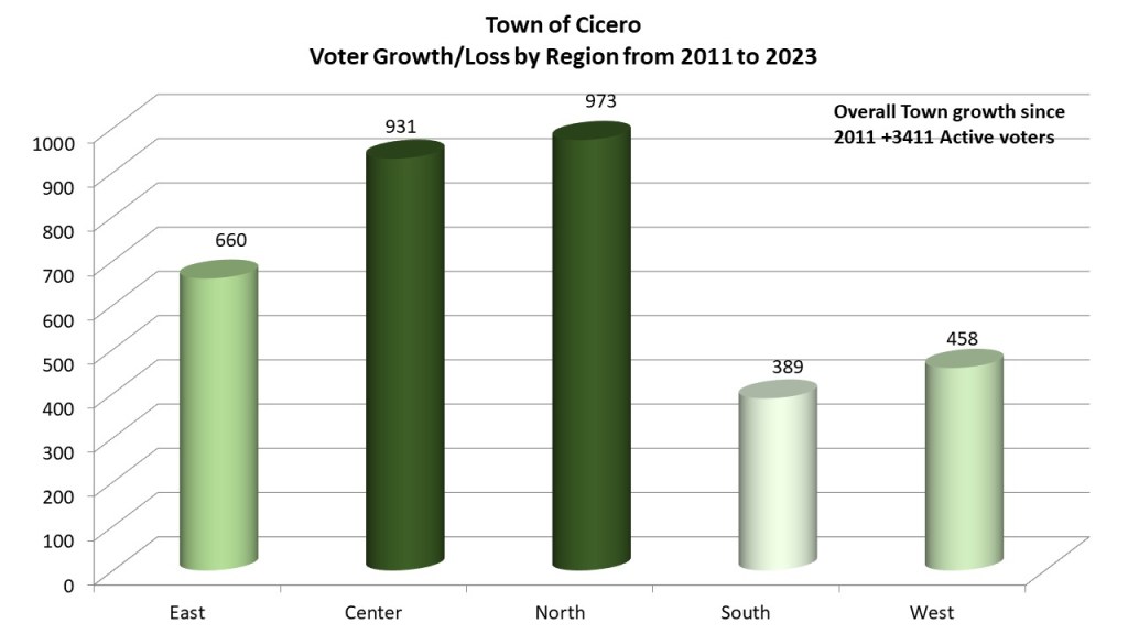 Looking at the growth of voters since the last redistricting cycle we compare it with date from right before redistricting of 2012. The Town of Cicero grew by 3411 active voters since 2011. The northern Bridgeport region saw the most growth with a gain of 973 voters. In close second, we saw the Center region with a nearly equal gain of 931 voters. The Eastern portion of Cicero had moderate growth of 660 voters. The western district (+458) and southern region (+389) voters saw the least gain. With Micron coming to neighboring Clay all these regions are likely choices for the influx of voters and it will be interesting to see the growths come next redistricting cycle.