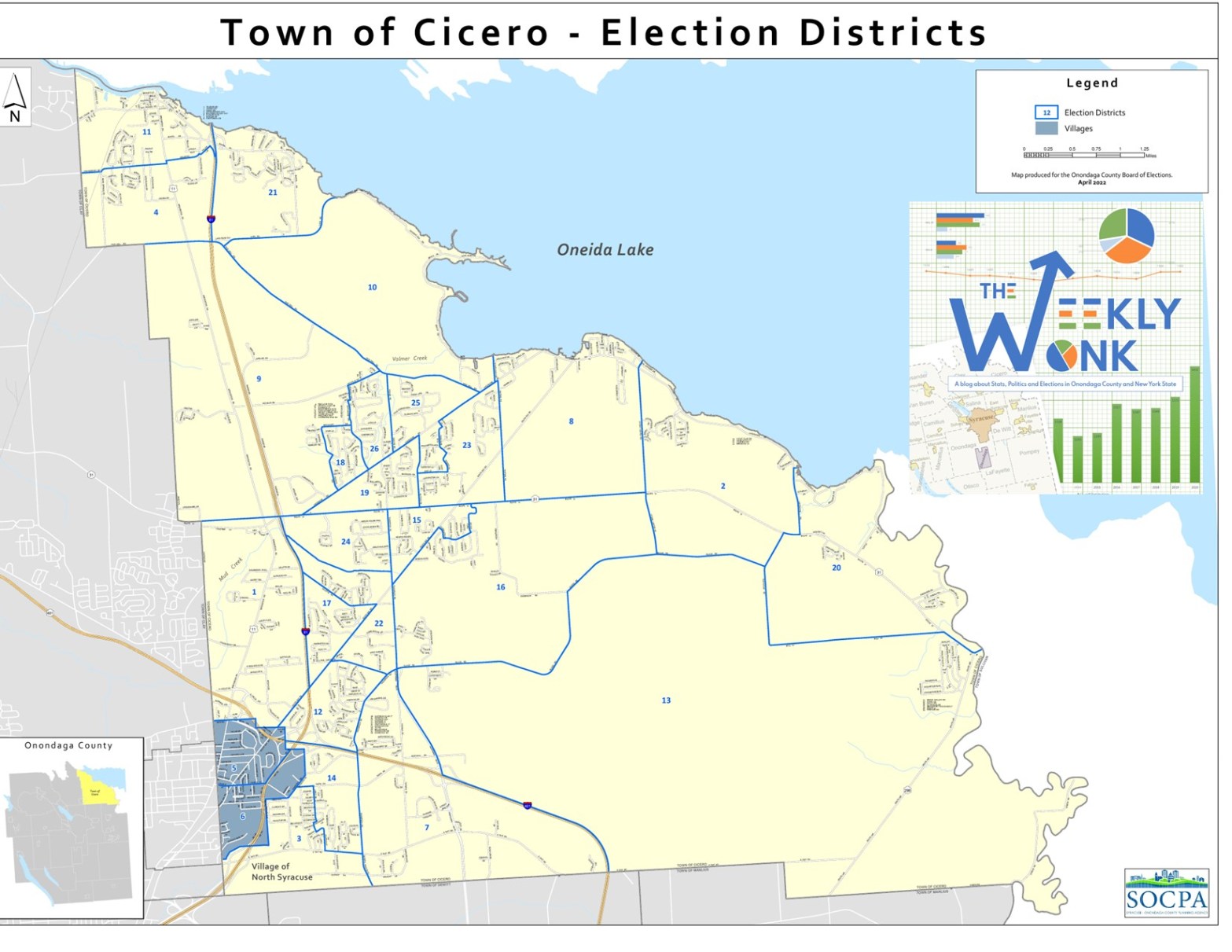The Town of Cicero sits in the most Northeastern portion of our County. It is a large sized suburban town with 22,449 voters, the third highest town in Onondaga County. It is considered a suburban town but doesn’t share a border with Syracuse nestled between Clay, Manlius and Salina. The Town of Cicero is considered a solid GOP town, the largest political subdivision in Onondaga County with a significant GOP enrollment advantage. The makeup of Cicero is 30% Democrat (6745 Voters), 34% GOP (7547 Voters), and 29% non-Enrolled (6444 voters). This year I am breaking down the Towns into as equal as possible regions. Northern Cicero (eds 4,9,10,11, & 21) has 4660 voters (21%). Central Cicero (Eds 18, 19, 23, 25, 26) has 4354 voters (19%). Eastern Cicero (eds 2, 7, 8, 13, 16, & 20) has 5328 voters (24%). Southern Cicero (Eds 3, 5, 6, 12, & 14) has 4003 voters (18%). Western Cicero (eds 1, 15, 17, 22, 24) has 4104 voters (18%).