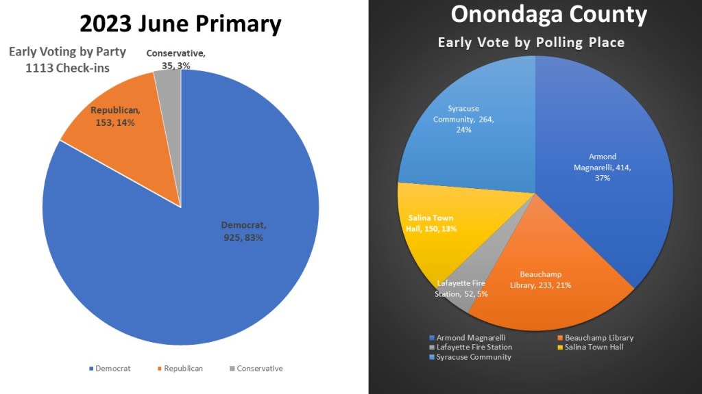 The June 2023 primary was smaller in scale than most primaries. Only Democrats in the City of Syracuse, Republicans in the Towns of Pompey and Salina, and Conservatives County wide. 1,113 Voters checked in to vote Early in the 2023 primary. 925 Democrats, 153 Republicans, and 35 Conservatives showed up to the five open Early Voting sites. Since the primary was smaller in scope both in number of voters and geographic locations. The three locations in the City led all Early Voting with 414 voters going to Armond Magnarelli Center (37%), 264 at Syracuse Community Connections (24%), and 233 at Beauchamp Library (21%) The suburban sites did not do as well with Salina Town hall chosen for proximity to the GOP primary there having 150 voters (11%) and Lafayette Fire station just next door to the Town of Primary at 52 voters (5%).