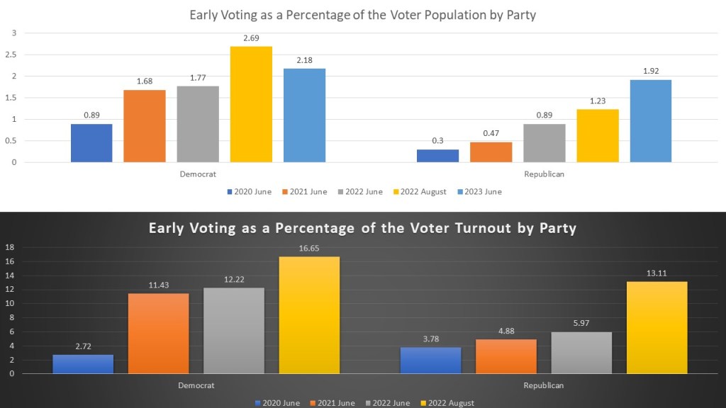 One of the reasons why Early Voting is growing as a share of the population is that we are seeing more adoption of Early Voting by the GOP as opposed to just Democrats. The GOP performed better than Democrats when looking at overall voter population eligible for this election. Democrats saw a fall in participation at 2.18% of the eligible population Early Voting, down from 2.69& in the august primary last year. The GOP was just 1.92% of their voting population, which represents a rise from last year and previous years. In fact, when you look at the percentage of the turnout Democrats did have the larger percentage of the voters who chose to turnout show up at 16.65% Early Vote. However, the GOP came closer than ever to matching the Democratic voter share with 13.11% of their voters choosing to Early Vote.